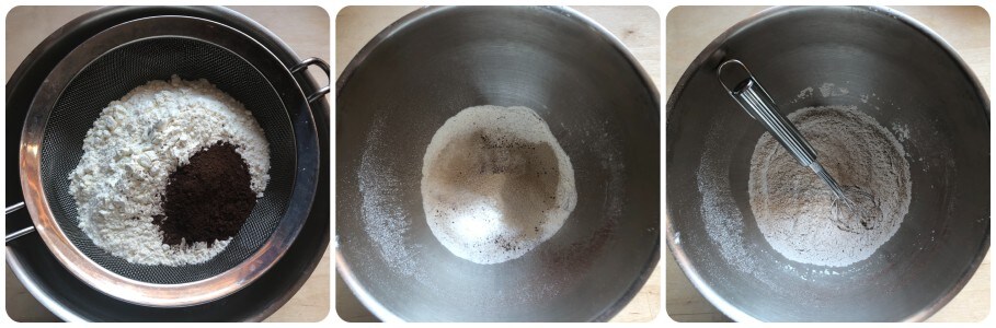 Verser dans le bol du robot la farine et le cacao amer en les tamisant à travers une passoire à mailles fines. Puis ajouter la levure de bière sèche et le sucre, et mélanger avec un petit fouet à main. Si vous utilisez de la levure de bière fraîche, ne l’ajoutez pas maintenant mais dissolvez-la dans le lait tiède avant de l’ajouter à la farine.