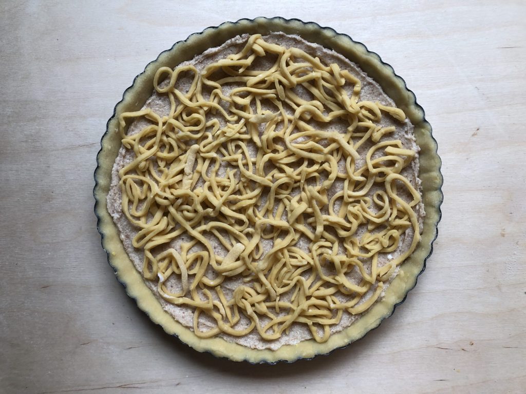 J’ai préparé la pâte brisée, les tagliatelles et la garniture de ce gâteau avec le Thermomix mais vous pouvez utiliser n’importe quel autre mixeur. Bien sûr, il est également possible de réaliser la pâte brisée à la main.