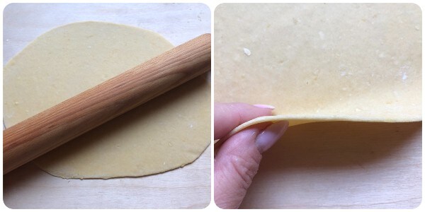 Transférer la pâte sur le plan de travail légèrement fariné et l’étaler avec le rouleau à pâtisserie jusqu’à obtenir une feuille fine.
