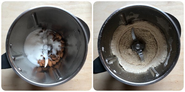 Mettre dans un mixeur les amandes avec le sucre et les hacher finement (avec le Thermomix 10 sec à vit. 8).