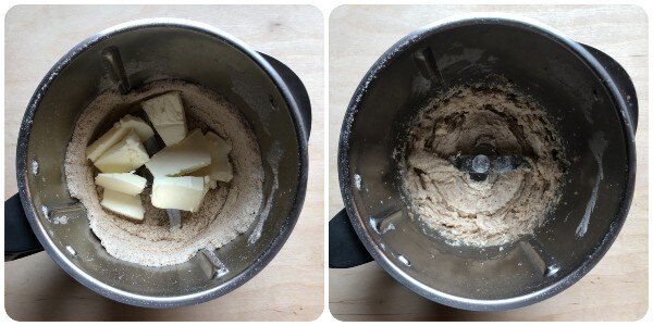 Rassembler au centre le reste, puis ajouter la farine, le sucre, le beurre en morceaux, un œuf, une pincée de sel et pétrir (1 minute, vitesse Épi). On obtient un mélange très friable.