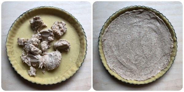 Retirer la pâte brisée du réfrigérateur, la transférer sur le plan de travail fariné et l’étaler avec le rouleau à pâtisserie. Puis la placer à l’intérieur d’un moule à tarte avec fond amovible de 22 cm de diamètre préalablement beurré et fariné. Niveler le bord. Si vous n’avez pas ce moule et souhaitez l’acheter, vous pouvez le trouver en cliquant ICI.