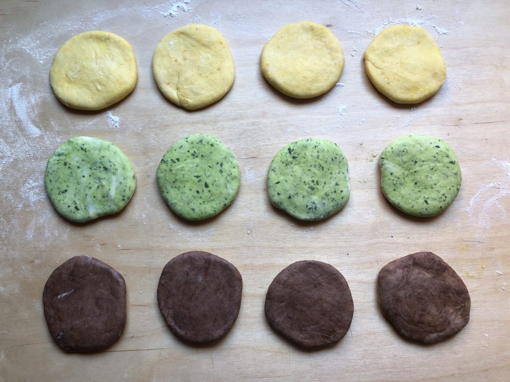 • Après l’heure de repos, casser la levée et ajouter la purée de citrouille, les épinards hachés et le cacao dans leurs pâtes respectives. Il sera probablement nécessaire d’ajouter une cuillère à soupe de lait à la pâte marron. Il faudra, par contre, un peu de farine (mais peu) dans les deux autres pâtes.
