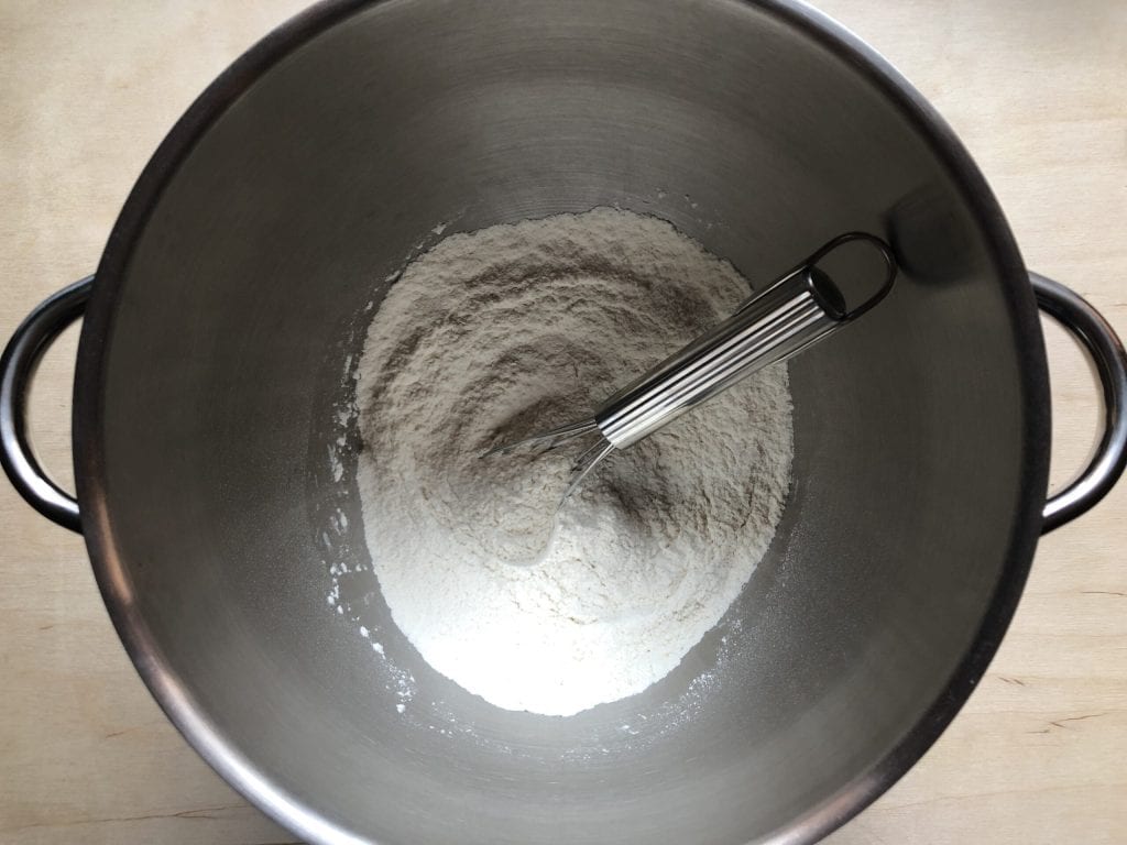 • Quand le levain est prêt, mettre dans le bol du robot pâtissier la farine et le sucre et les mélanger avec un petit fouet à main.