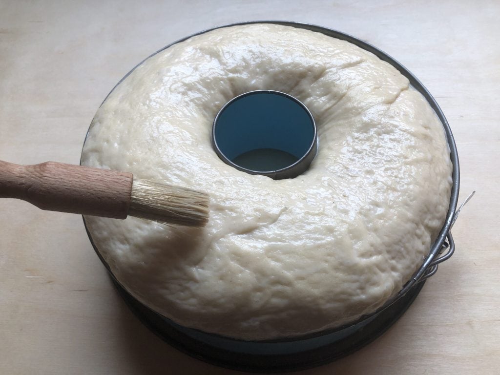 • Après le temps de cette première levée, transférer la pâte dans un moule à gâteau d’un diamètre de 26 cm préalablement beurré et fariné, le couvrir avec un torchon propre et le laisser lever pendant encore une heure environ.