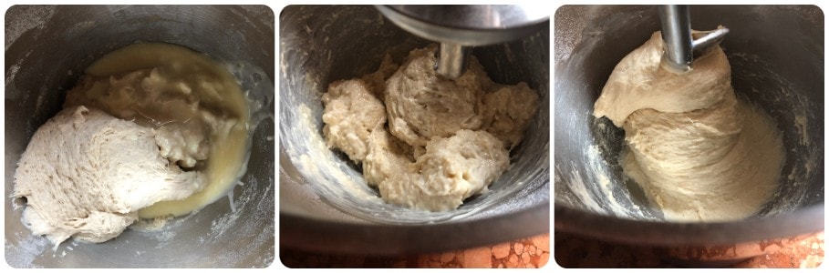 • Maintenant, ajouter le levain, une pincée de sel et le beurre désormais tiède et pétrir longtemps avec le fouet à crochet. Vous obtiendrez une pâte douce et un peu collante.
