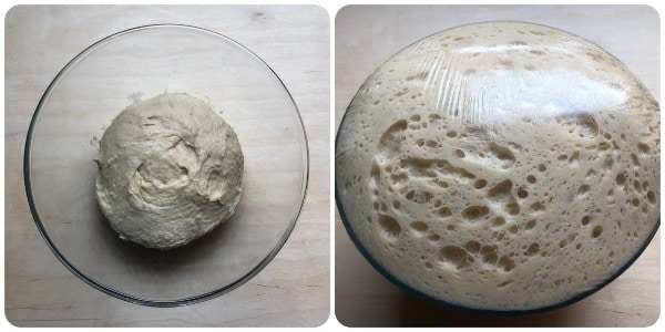 • Transférer dans un grand bol, couvrir avec du film alimentaire et laisser lever jusqu’au doublement du volume dans un endroit tiède et à l’abri des courants d’air : le temps de levée dépend beaucoup de la température de l’environnement et peut varier de deux à trois heures.