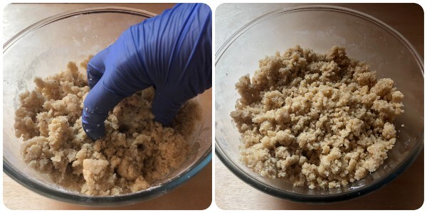 À ce stade, commencer à travailler la pâte avec les mains afin de bien amalgamer les ingrédients et de former de grosses miettes.