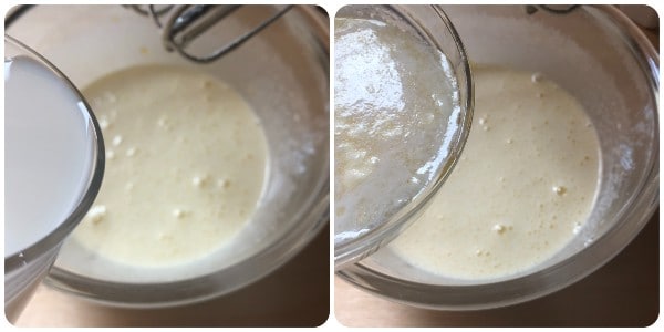 Ajouter le lait et le beurre tiède et mélanger à nouveau avec les fouets.
