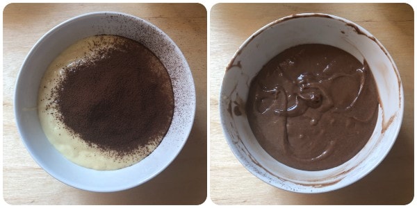 Faire de même avec le deuxième bol en ajoutant le cacao sucré.