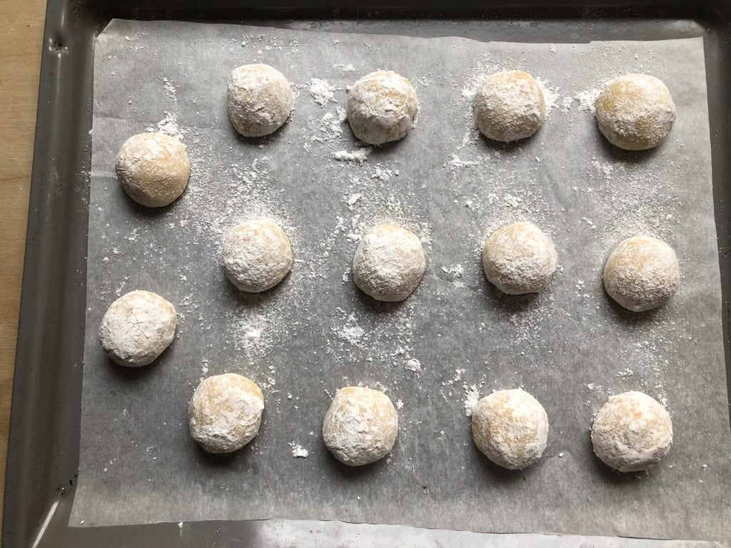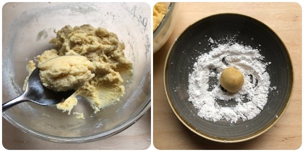 Avec une cuillère, prélever 24/25 grammes de pâte, former une boule avec les mains et la rouler dans le sucre glace jusqu’à ce qu’elle soit complètement recouverte.
