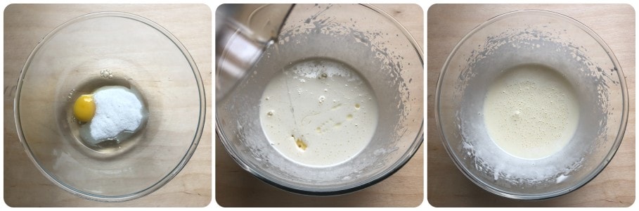 Dans un autre saladier, plus grand, mettre l’œuf et le sucre et les fouetter avec les fouets électriques jusqu’à obtenir un mélange clair et mousseux.