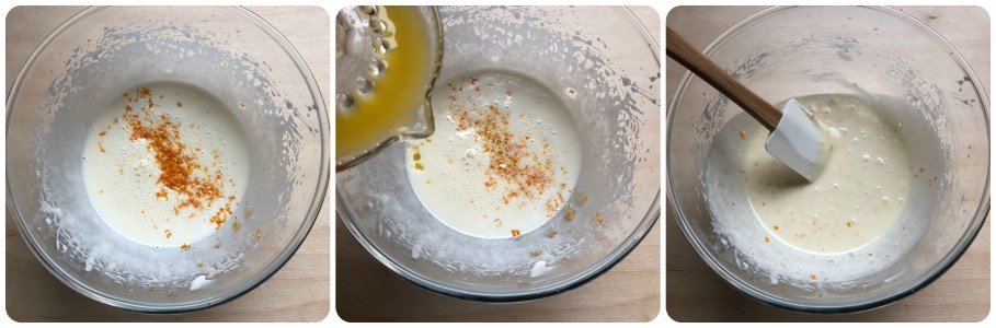 Ajouter au mélange d’œufs le zeste et les 20 ml de jus d’orange et mélanger avec une spatule.