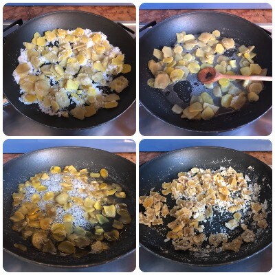 Une fois le temps écoulé, les égoutter à l’aide d’une écumoire et les transférer dans une poêle antiadhésive avec le sucre semoule.