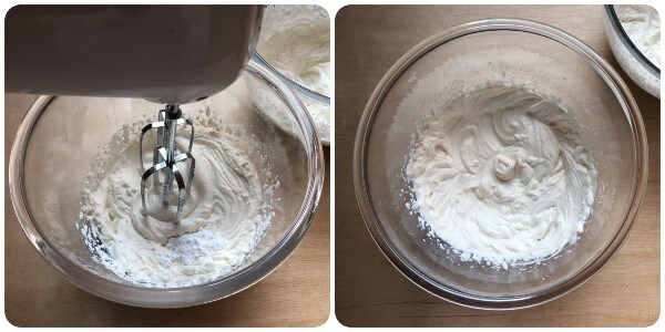 Dans un autre bol, travailler le fromage frais à tartiner avec les fouets en y ajoutant le reste de sucre glace (20 g).