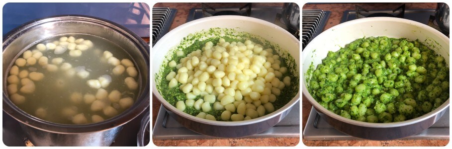 Transférer le pesto ainsi obtenu dans une large poêle avec quelques cuillères à soupe d’eau de cuisson des gnocchetti et le chauffer à feu doux.