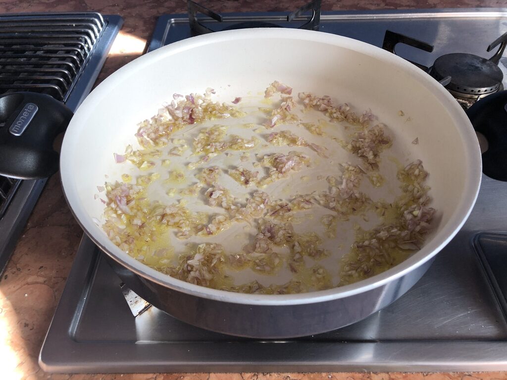 Épluchez l’échalote, hachez-la finement et faites-la revenir dans quelques cuillères à soupe d’huile dans une grande casserole.