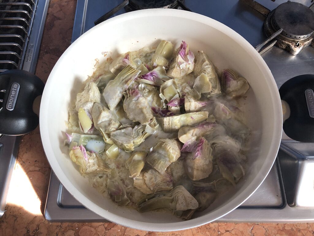 Laissez-la frémir pendant quelques minutes, puis ajoutez les cœurs d’artichaut encore surgelés, 50 ml de lait et quelques cuillères d’eau chaude.