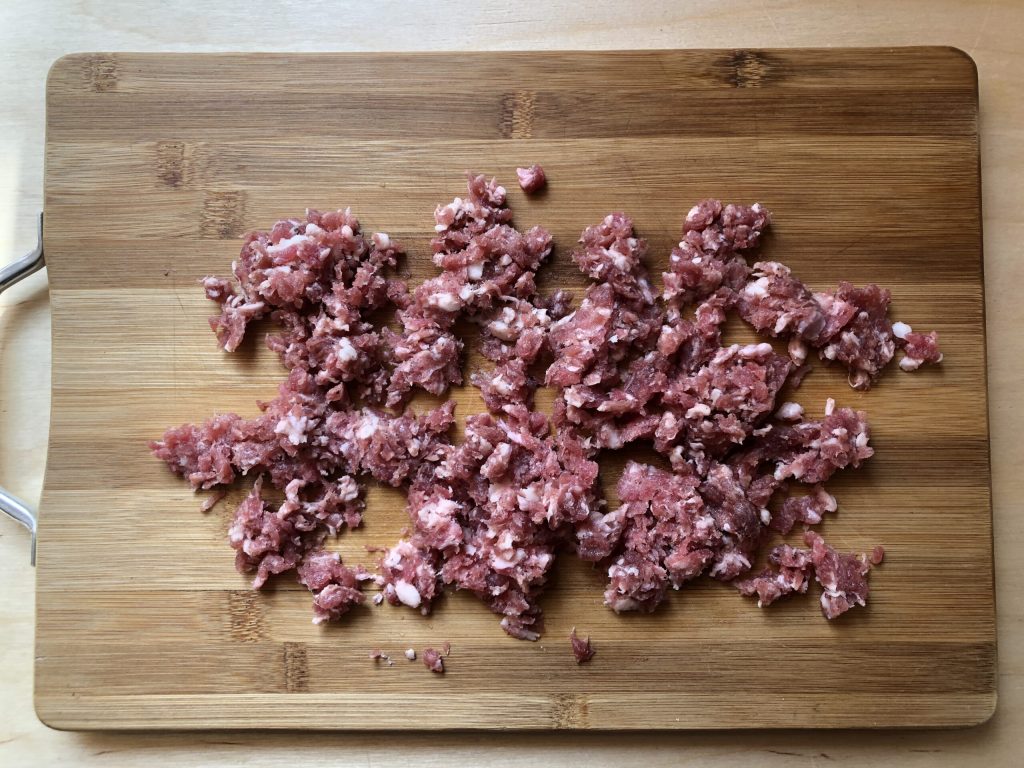 Peler la saucisse et la réduire en miettes grossières avec une fourchette.