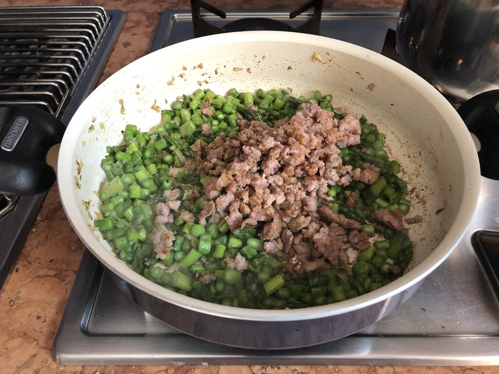 Dans la même poêle où la saucisse a été dorée, chauffer quelques autres cuillères à soupe d’huile et y faire revenir l’échalote finement hachée. Lorsqu’elle commence à blondir, ajouter les asperges (tiges et pointes), une généreuse pincée de sel, un tour de moulin à poivre et quelques cuillères d’eau chaude.