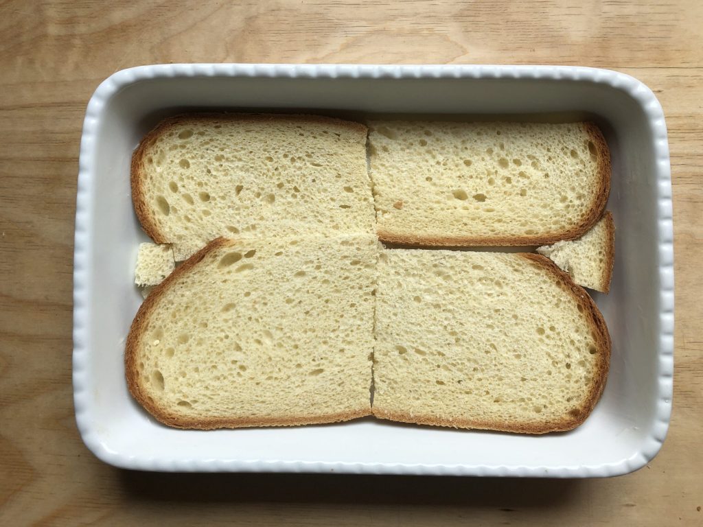 Après ce temps, beurrer légèrement un plat à gratin rectangulaire et disposer les tranches de pain de manière à couvrir entièrement le fond (coupez-les à la bonne taille, si nécessaire). Encore une fois, demandez à les faire trancher au moment de l’achat si vous ne les trouvez pas déjà tranchées.
