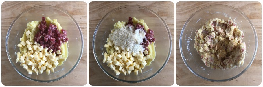 Ensuite, ajoutez la saucisse émiettée, les dés de fontina, 40 g de fromage râpé et mélangez bien pour amalgamer tous les ingrédients. Assaisonnez de sel et de poivre.