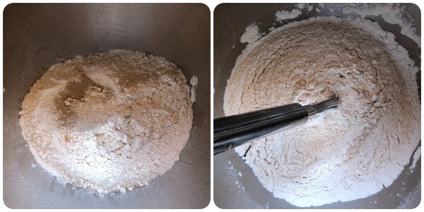 Mettre la farine, la levure et le sucre dans le bol du robot pâtissier et les mélanger avec un petit fouet à main.