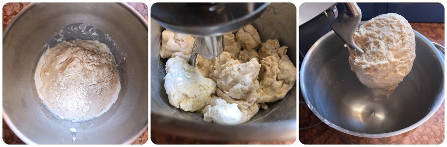 Verser ensuite l’eau tiède et commencer à pétrir avec le crochet jusqu’à ce que le mélange soit homogène. À ce stade, ajouter également l’huile et le sel. Travailler longuement jusqu’à ce que la pâte soit bien accrochée au crochet.
