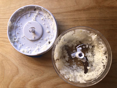 Pelez l’oignon et hachez-le finement. J’ai utilisé un hachoir manuel à corde que je trouve vraiment pratique. Si vous souhaitez l’acheter, vous pouvez le trouver en cliquant ICI.