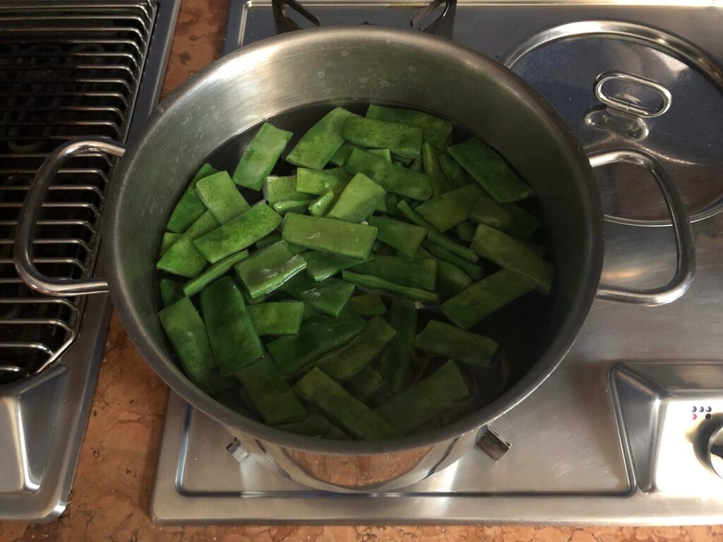 Équeuter les haricots plats, les laver bien sous l’eau courante et les couper en morceaux.