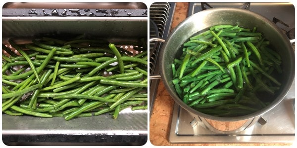 Équeuter les haricots verts, les laver et les cuire dans de l’eau bouillante salée.