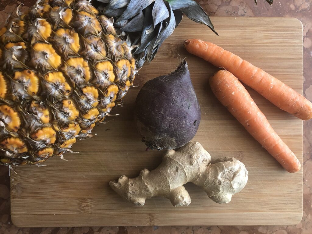 Je déteste les betteraves rouges ! Je ne les aime vraiment pas. Et pourtant, elles sont si bonnes pour la santé. Elles sont riches en fibres, en sels minéraux, en vitamines et en antioxydants. Grandes sources de fer, elles aident à purifier le sang. Et elles sont faibles en calories. De plus, grâce à leur teneur élevée en bétaïne, elles nous protègent du mauvais cholestérol. Bref, il faudrait en manger souvent. Donc, que faire ? La solution est vite trouvée : je les bois ! Et je vous conseille de faire de même en préparant ce délicieux jus rouge à la betterave qui contient aussi de l’ananas, des carottes et du gingembre. Délicieux et velouté, je l’ai savouré jusqu’à la dernière goutte. Une grande dose de santé dans un verre. Parfait, donc, même si vous avez des enfants qui ne veulent pas manger de fruits ou de légumes. Eh bien, faites-leur boire ce jus car ils ne diront jamais non aux jus.