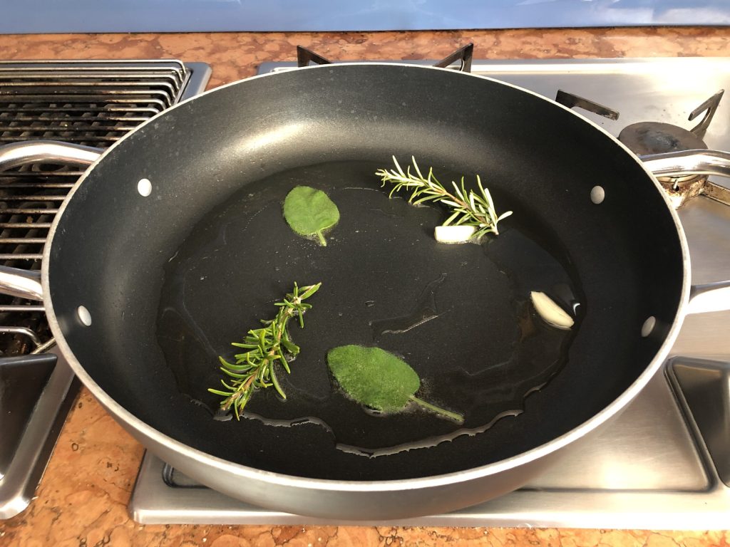 Pendant ce temps, dans une large casserole, chauffez quelques cuillères d’huile avec une gousse d’ail coupée en deux, deux brins de romarin et deux feuilles de sauge.