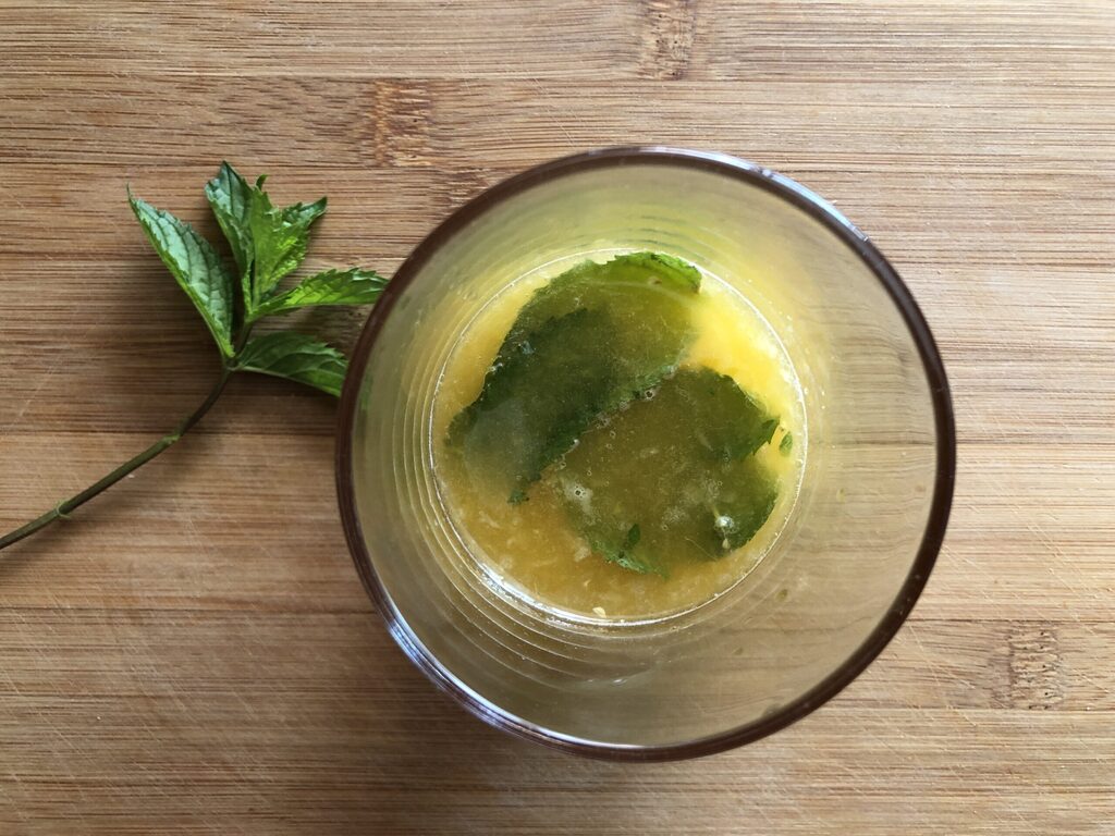 Laver les feuilles de menthe et les mettre dans un verre. Ajouter une cuillère à café de sucre de canne et le jus d’un demi-citron (30 ml) et laisser macérer pendant une demi-heure.