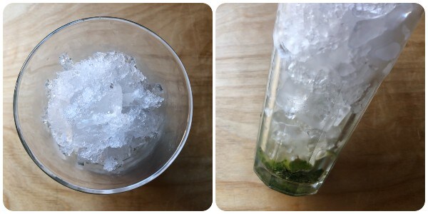 Ensuite, remplir le verre avec de la glace qui doit être cassée et non concassée ni laissée en cubes. Moi, très artisanalement, je mets les cubes à l’intérieur d’un torchon propre et je les casse avec un attendrisseur à viande.