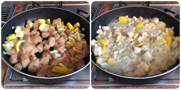 Dans un grand plat, chauffer quelques cuillères d’huile avant d’ajouter les morceaux de poulet et les morceaux de citron. Les faire dorer à feu vif pendant 5 minutes en les mélangeant souvent, puis les arroser de vin blanc et le laisser évaporer.