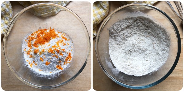 Tout d’abord, dans un bol moyen, mélanger la farine avec la levure, le bicarbonate, une pincée de sel et le zeste d’orange obtenu avec une râpe à agrumes. De cette façon, la farine sera très parfumée.
