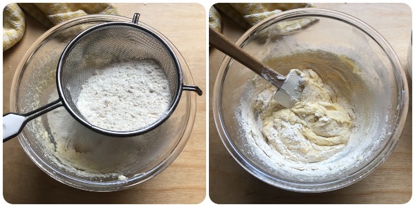 À ce stade, ajouter progressivement les ingrédients secs en les tamisant à travers une passoire à mailles fines et en les incorporant avec une spatule.