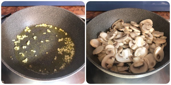 • Dans une casserole, chauffer quelques cuillères d’huile et y faire revenir une gousse d’ail finement hachée. Si vous n’aimez pas l’ail, vous pouvez le laisser entier afin de l’enlever facilement à la fin de la cuisson. Laissez-le frémir un instant avant d’ajouter les champignons.