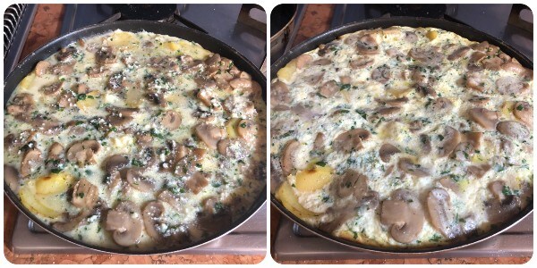 • Répartir bien les pommes de terre au fond de la poêle et les couvrir avec les champignons en essayant de les distribuer également de manière uniforme.