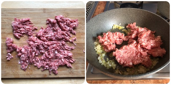 • Laisser frémir quelques instants, puis ajouter les deux saucisses préalablement débarrassées de leur peau et émiettées avec une fourchette.