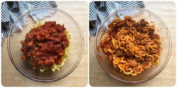 • Lorsque la sauce tomate et saucisse est prête, la verser dans le bol de pâtes, bien mélanger et laisser tiédir.