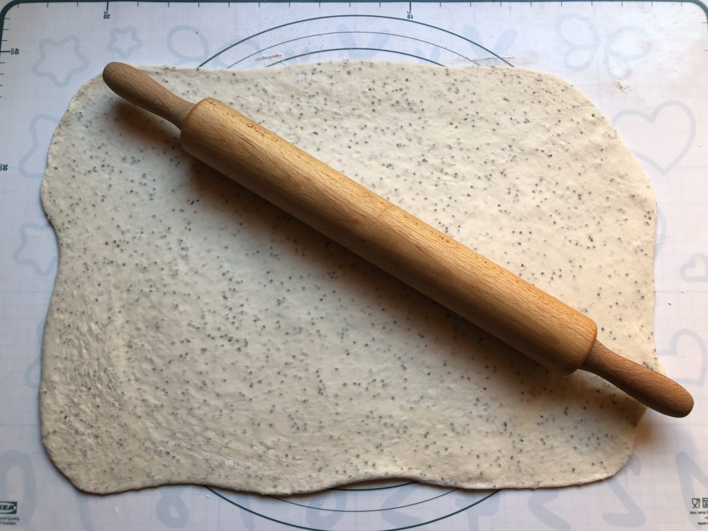 • À la fin de la levée, transférez la pâte sur le plan de travail légèrement fariné et étalez-la avec le rouleau à pâtisserie en lui donnant la forme d’un rectangle (environ 45 x 30 cm).