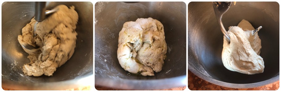 J’ai préparé la pâte de ce pain de kamut avec le robot pâtissier, mais vous pouvez également le réaliser à la main en travaillant les ingrédients d’abord dans le bol puis sur le plan de travail. Il vous faudra simplement un peu plus de temps pour obtenir une pâte bien souple, c’est-à-dire une pâte qui ne se déchire pas lorsqu’elle est étirée.