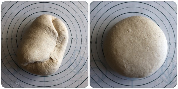 Placer la boule dans un grand bol légèrement fariné, couvrir avec du film alimentaire et laisser lever dans un endroit tiède et à l’abri des courants d’air jusqu’au doublement du volume. Le temps dépend de la température ambiante et peut aller de 2 à 3 heures.