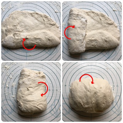 Après ces 30 minutes, faire un premier tour de plis : avec les doigts légèrement humides, prendre un côté de la pâte, l’étirer vers l’extérieur et le replier sur la pâte elle-même. Répéter cette opération pour chaque côté de la pâte (donc trois autres plis). Couvrir et laisser reposer à température ambiante pendant 30 minutes supplémentaires.