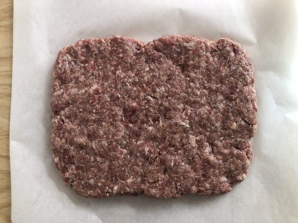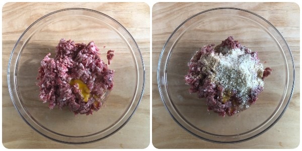 • Mettre la viande hachée dans un grand bol, ajouter la saucisse sans boyau et émiettée, l’œuf, la chapelure, le fromage râpé, une généreuse pincée de sel et un bon tour de moulin à poivre noir.