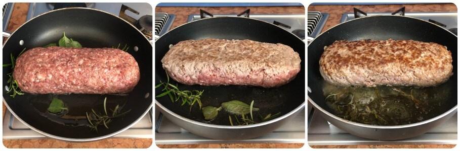 • Déposer le pain de viande et le faire dorer sur tous les côtés en le retournant délicatement avec deux spatules. Puis le mouiller avec le vin blanc et le laisser légèrement évaporer.