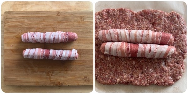 • Enrouler chaque saucisse avec deux tranches de bacon et les placer au centre du rectangle.