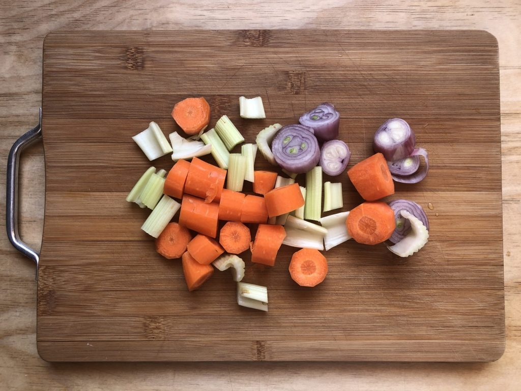 Éplucher l’échalote, gratter les carottes et nettoyer le céleri. Laver bien ces légumes et les couper en morceaux.
